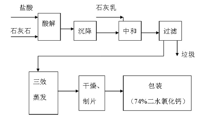 酸法:用 22% 左右的稀盐酸与石灰石(含钙 52% 左右) 反应制得 27% 的液体化钙,经过滤分离把滤渣弃去,滤液用石灰乳进行中和调节, ph=8.9-9 ,氯化钙溶液中的氢氧化镁,氢氧化铁,氢氧化铝等沉淀,用压滤机进行过滤,滤饼为固体废物,滤液进行三效强制循环真空蒸发(加热至 172 ℃ -174 ℃ 蒸发,经过结晶,分离后于 200 ℃ -400 ℃ 下干燥脱水,既得二水氯化钙,再将二水氯化钙加热至 260 ℃ -300 ℃ ,干燥脱水,即变为白色无水氯化钙)将 27% 氯化钙溶液浓缩到 68-69% 后进入结片机进行制片,片状氯化钙再进行流化床干燥生产 74% 含量二水氯化钙